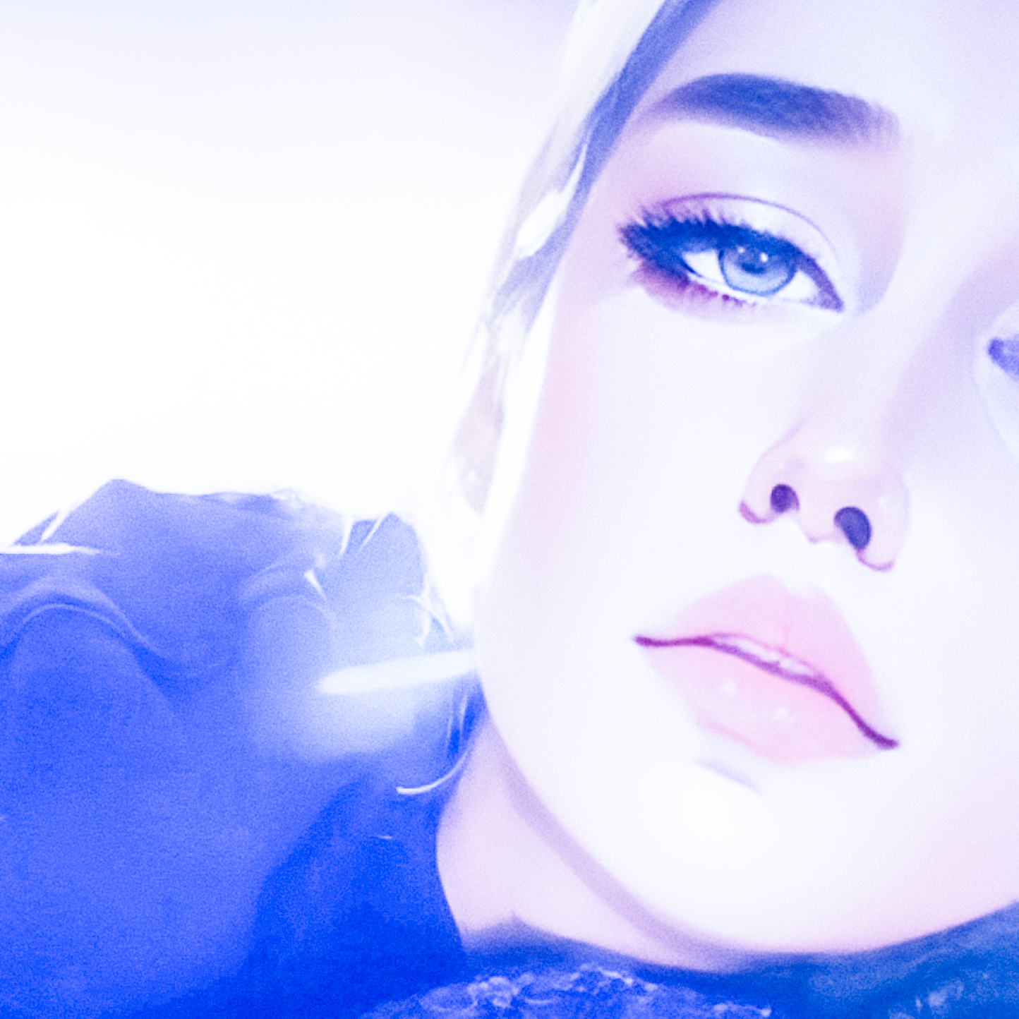 • Vyrènne with long dark hair, tan skin, and eye makeup, lying down with shadows cast across her face.