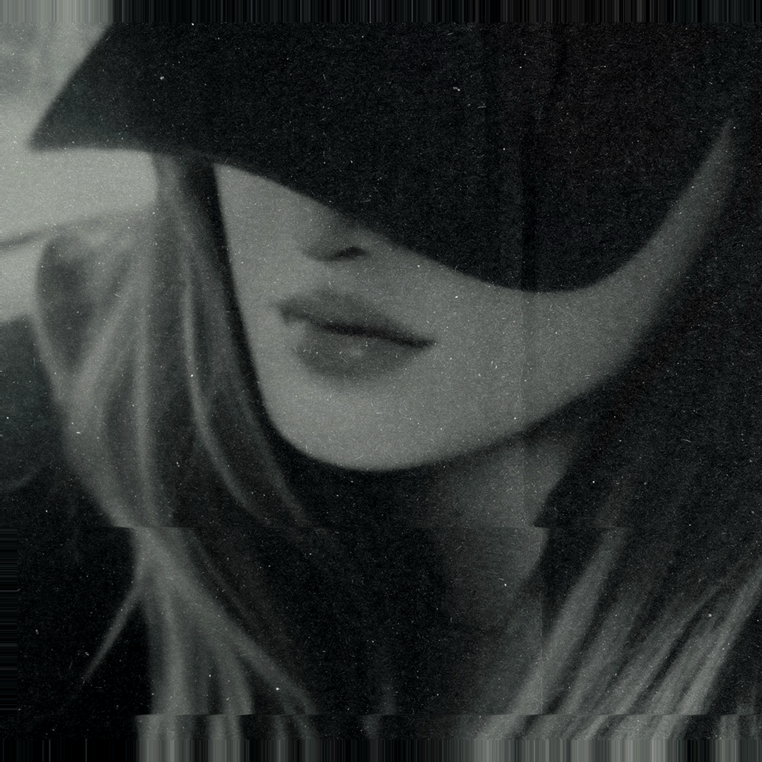 • A black and white digital portrait of Vyrènne with long blonde hair, and half of her face intact and the other half distorted by digital photography glitch effects.